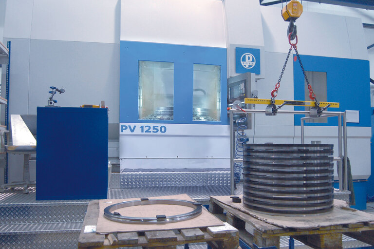 „Die Kugeldrehverbindung muss deshalb auf ein Zehntel genau positionierbar sein.“ Um das zu erreichen, wählte Rodriguez ein Produkt mit einer besonders hohen Steifigkeit und optimiertem Anlaufdrehmoment. Insgesamt Anforderungen, die eine Lösung „von der Stange“ leider nicht erfüllen konnte. Rodriguez liefert deshalb eine zu 100% kundenspezifisch konstruierte Kugeldrehverbindung mit den Maßen 672 x 813,5 x 56 mm. Die Lagerringe sind aus geschmiedeten Ringen in 42CrMo4 gefertigt. Das Bohrbild zur Befestigung wurde auf die kundenseitige Anschlusskonstruktion abgestimmt, sodass der Drehteller in drei gleichen Teilen montiert werden kann. Die integrierte Außenverzahnung ist zum Antrieb mit einem Zahnriemen geeignet.