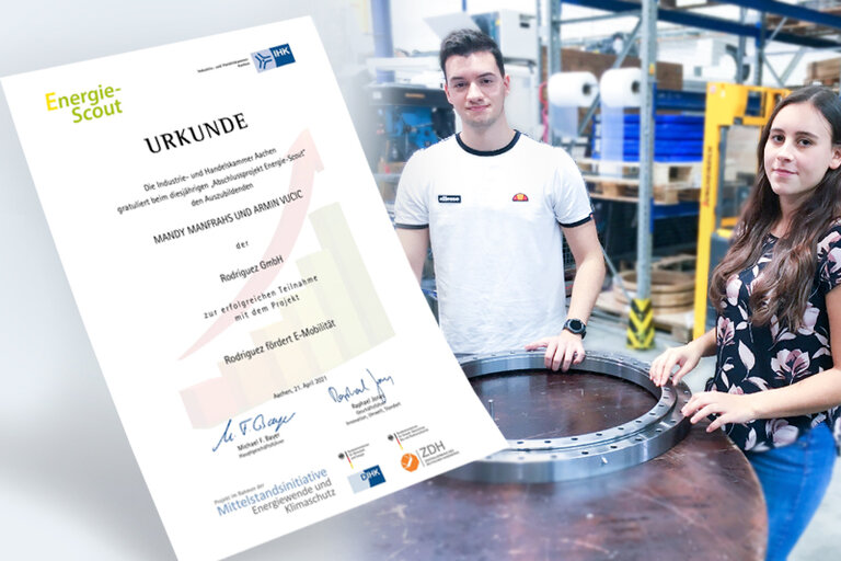 Die Auszubildenden erforschten das Thema E-Mobilität bei Rodriguez: Im Fokus lag dabei die Umstellung auf Hybrid-Fahrzeuge, die Nutzung von Pedelecs und die Realisierung unternehmenseigener Ladesäulen. So sollen die firmenbezogene Mobilität optimiert, die Belegschaft sensibilisiert, Energie gespart und der CO2-Ausstoß gesenkt werden. „Es ist beeindruckend, was unsere Nachwuchskräfte hier erarbeitet haben“, so Julia Schneiders, Ausbildungsbeauftragte bei Rodriguez. „Die Ideen und Impulse werden wir auf dem Weg zu noch mehr Nachhaltigkeit in unserem Unternehmen definitiv berücksichtigen.“ Die beiden Energie-Scouts absolvieren jeweils im zweiten Jahr ihre Ausbildung bei Rodriguez - Mandy Manfrahs als Groß- und Außenhandelskauffrau und Armin Vucic als Fachinformatiker, Fachrichtung Systemintegration.